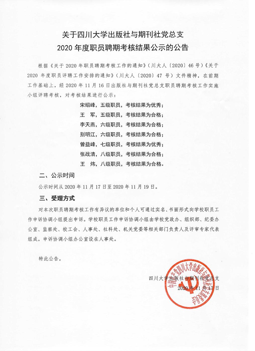 关于9428cn太阳集团古天乐与期刊社党总支2020年度职员聘期考核结果公示的公告