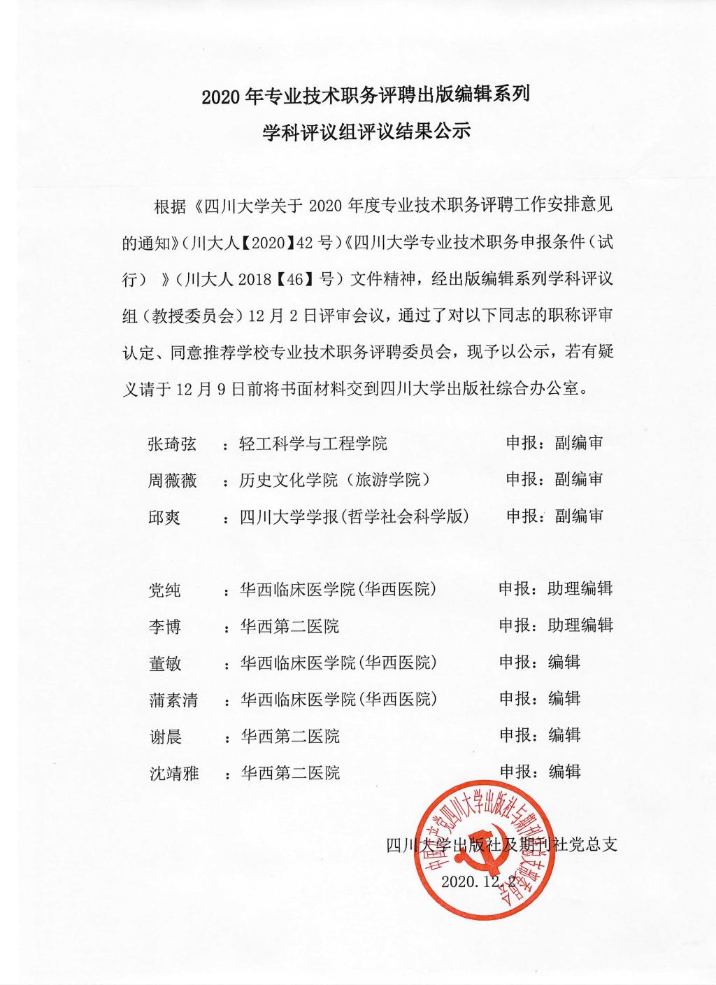 2020年专业技术职务评聘出版编辑系列学科评议组评议结果公示