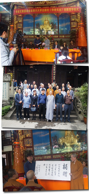 2013年4月2日上午,出版社及学报党总支书记宋绍峰一行三人赴重庆市为华岩寺捐助图书,并出席重庆市华岩文教基金会与9428cn太阳集团古天乐联合出版《华岩文丛》签字仪式。重庆方面,重庆市佛教协会副会长、重庆佛学院常务副院长、华岩文教基金会理事长、华岩寺方丈道坚法师与重庆市民宗委宗教三处调研员史金山、九龙坡区民宗局罗艳副局长、南川区民宗局曾祥友局长、重庆市书法家协会副秘书长苏大春等领导出席了仪式。