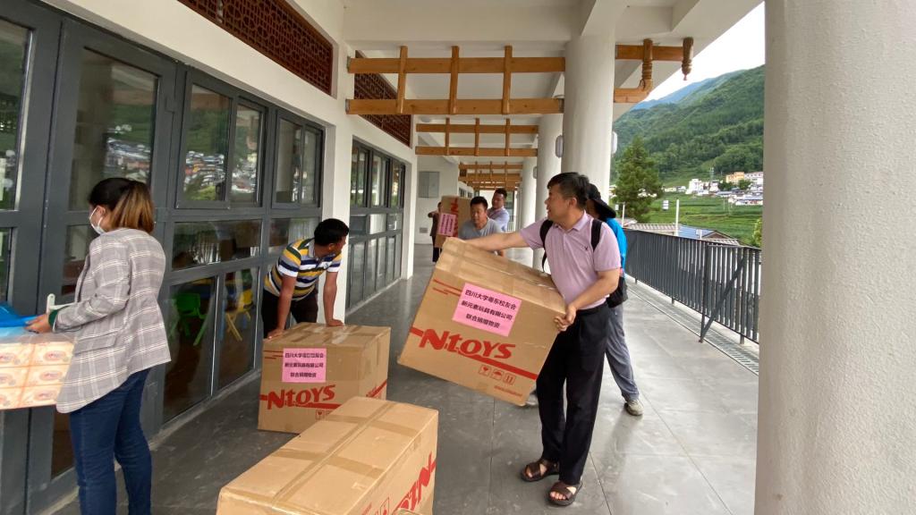 培训班开始后,宋绍峰、冉蜀阳一行在斯觉镇党委副书记董薇、副镇长李德兵、斯觉镇格布村第一书记吴先国、村党支部书记弟则胡子等同志的带领下,经过崎岖的山道,步行来到格布村幼儿园开展了捐赠活动。成人教育学院捐赠了幼儿玩具,出版社捐赠了幼儿图书。