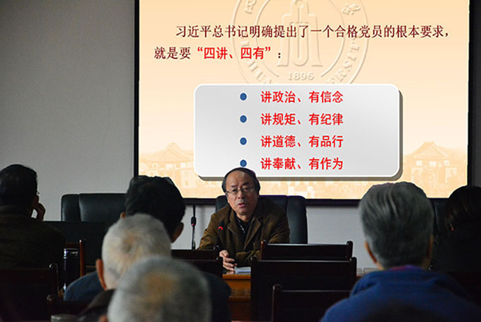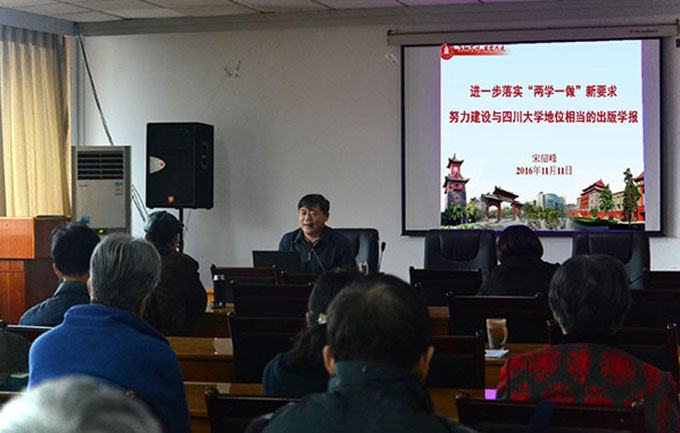 宋绍峰同志以“进一步落实‘两学一做’新要求,努力建设与四川大学地位相当的出版学报”为题做了报告,报告分三个部分,第一部分:“两学一做”基础在“学”——关键要学习贯彻习近平总书记系列重要讲话精神 ;第二部分:“两学一做”关键在“做”——核心是建设与四川大学地位相当的出版社及学报 ,根本是做合格党员 ;第三部分:“两学一做”有关具体工作安排和要求。