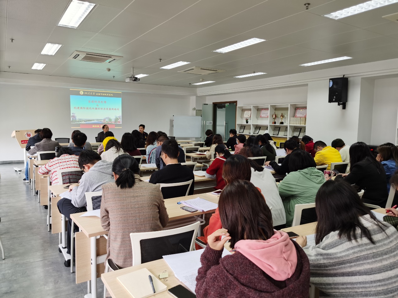 本次课程,蒋和胜教授围绕近期经济形势,结合多年来的学术研究成果,简要分析了后疫情时期的中美关系走向、当前经济政策与发展机会热点,重点讲授了畅通经济双循环的客观背景和主要内容。