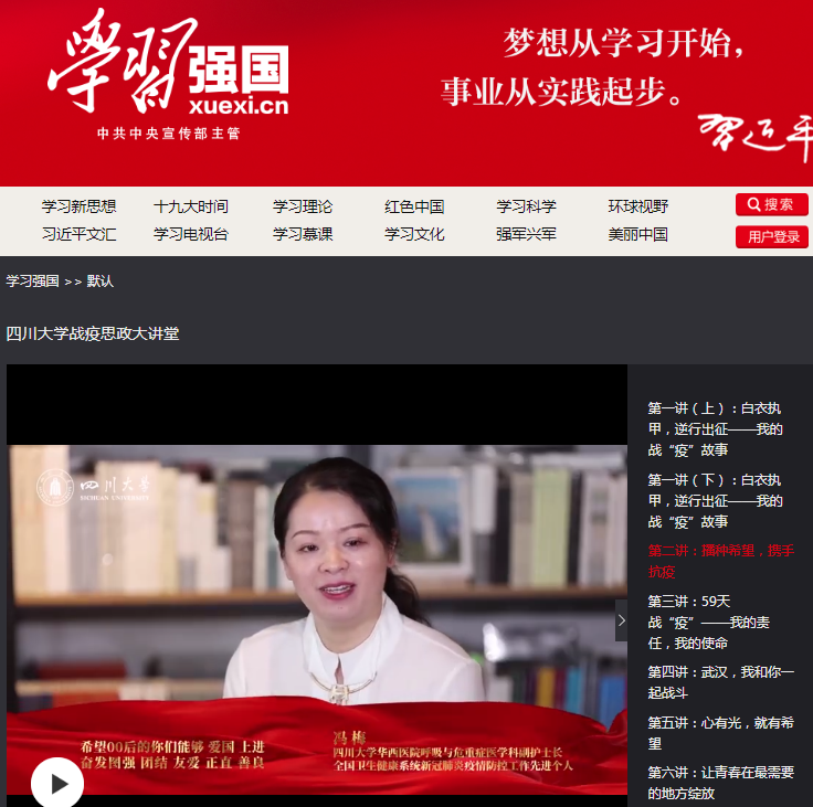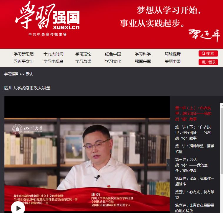 1.学习强国“四川大学战疫思政大讲堂”专题链接: https://www.xuexi.cn/lgpage/detail/index.html?id=15091880093480035477