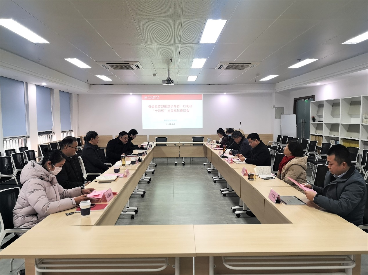 2021年1月5日上午,四川省委宣传部副部长、四川省出版局局长周青带领出版处马晓峰处长、吴蕾蕾副处长一行3人来我校调研出版工作。调研汇报座谈会在出版社513会议室举行。校党委副书记郭勇、校党委宣传部常务副部长徐海鑫出席会议,出版社与期刊社党政班子成员、部分编辑代表参加会议,会议由出版社与期刊社党总支书记、期刊社社长宋绍峰主持。