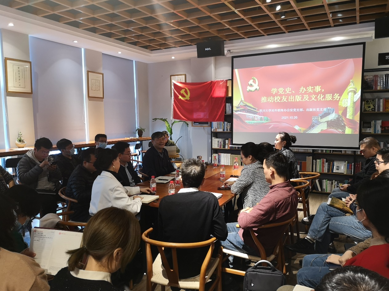 为深入学习贯彻习近平总书记在庆祝中国共产党成立100周年大会上的重要讲话精神,扎实开展党史学习教育,出版社与期刊社党总支联合学校对外联络办公室党支部于2021年10月26日上午在库闻书店开展“学党史、办实事,推动校友出版及文化服务”主题党日活动。学校对外联络办公室副主任白鹏、贾秀娥,出版社社长王军出席活动,学校对外联络办公室党支部全体成员,出版社与期刊社党总支出版社数字教辅大众编辑部党支部、出版社发行书店党支部、出版社语言文字编辑部全体成员及部分校友代表参加了活动。活动由出版社与期刊社党总支书记、期刊社社长宋绍峰主持。