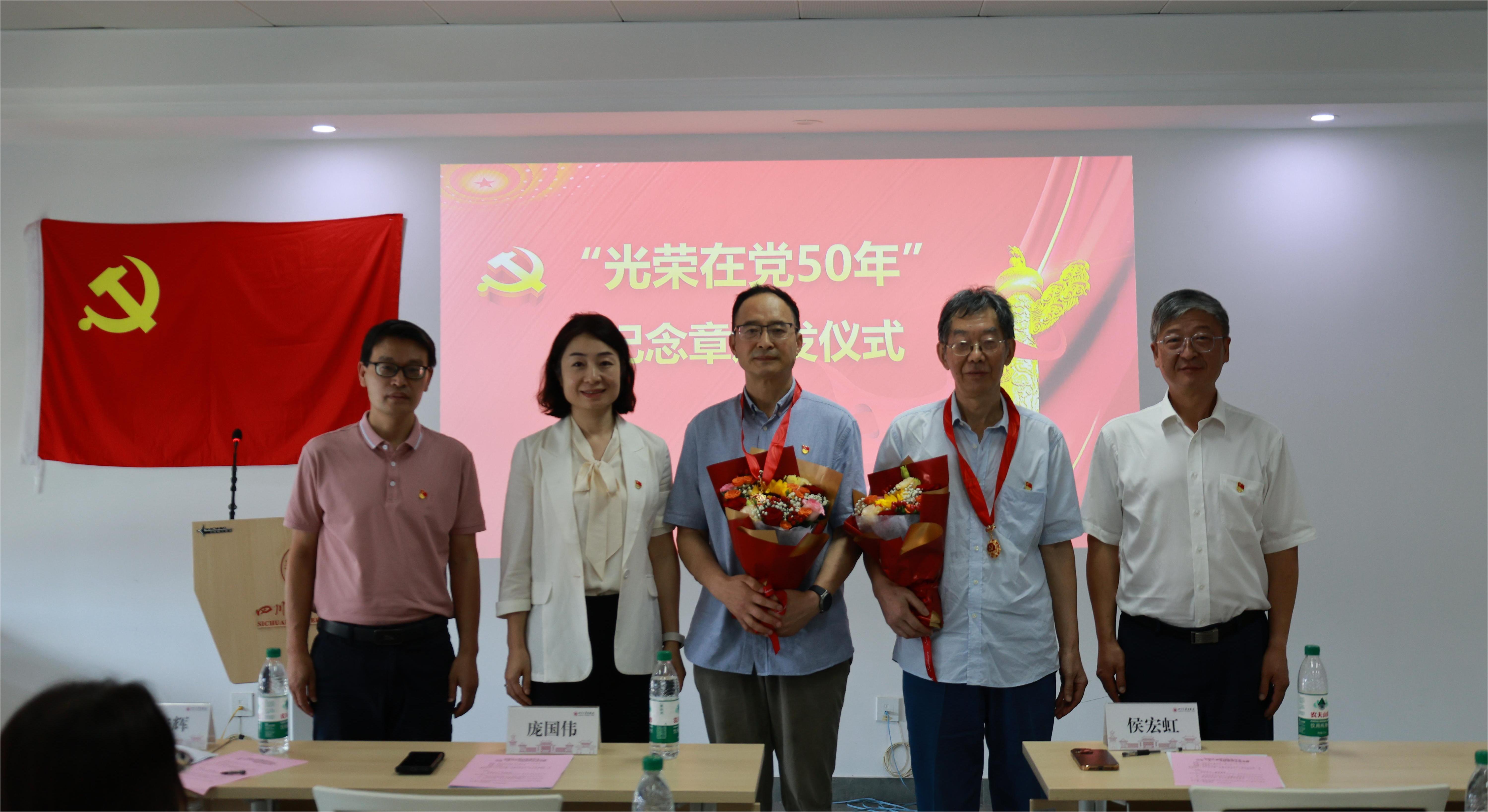 会议为获得由中共中央颁发的“光荣在党50年”纪念章的党员代表石大明、张晓舟同志颁发纪念章。